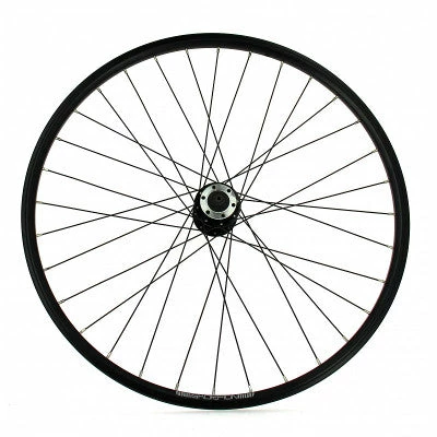Cette roue avant est spécialement conçue pour être montée sur un vélo tout terrain de 26 pouces. Son moyeu est spécialement conçu pour y fixer un disque de frein. Pour installer votre disque de frein, 6 vis M5 de 10 mm vous sont proposées en option. Si besoin, des disques de frein sont disponibles. Tous les éléments de roue (jante, moyeu et rayons) sont noirs. Son moyeu est en aluminium et il est livré avec son axe à serrage rapide. L’entraxe mesure 100 mm. La roue montée pèse 1120 grammes.